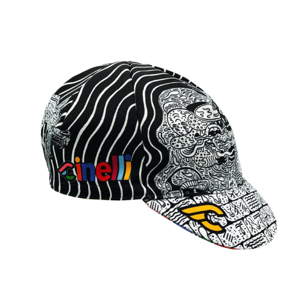 ルイ・コルデロによるチネリ・アート・プログラムのためのキャップコラボレーション。ルイ・コルデロは1978年フィリピン・マニラ生まれで、現在はマラボンを拠点に活動しています。受賞歴のある画家、彫刻家であり、自費出版のアンダーグラウンド・コミックシリーズ「Nardong Tae」の作者でもあります。サイクリングキャップは、自転車に乗っている時も乗っていない時も最適なアクセサリーです。肌寒い日にはヘルメットの下に着用することで保護力を高め、激しいライドでは汗による目へのダメージを防ぎます。イタリア製。
